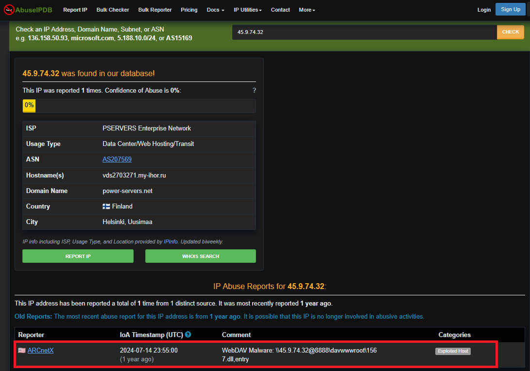 To validate the suspicious IP address, I checked it against AbuseIPDB.