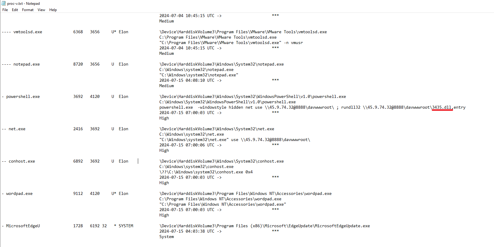 This confirms that powershell.exe (PID 3692) spawned net.exe (PID 2416) and executed a malicious command involving remote DLL loading via WebDAV, which aligns with the activity reported on AbuseIPDB referencing: