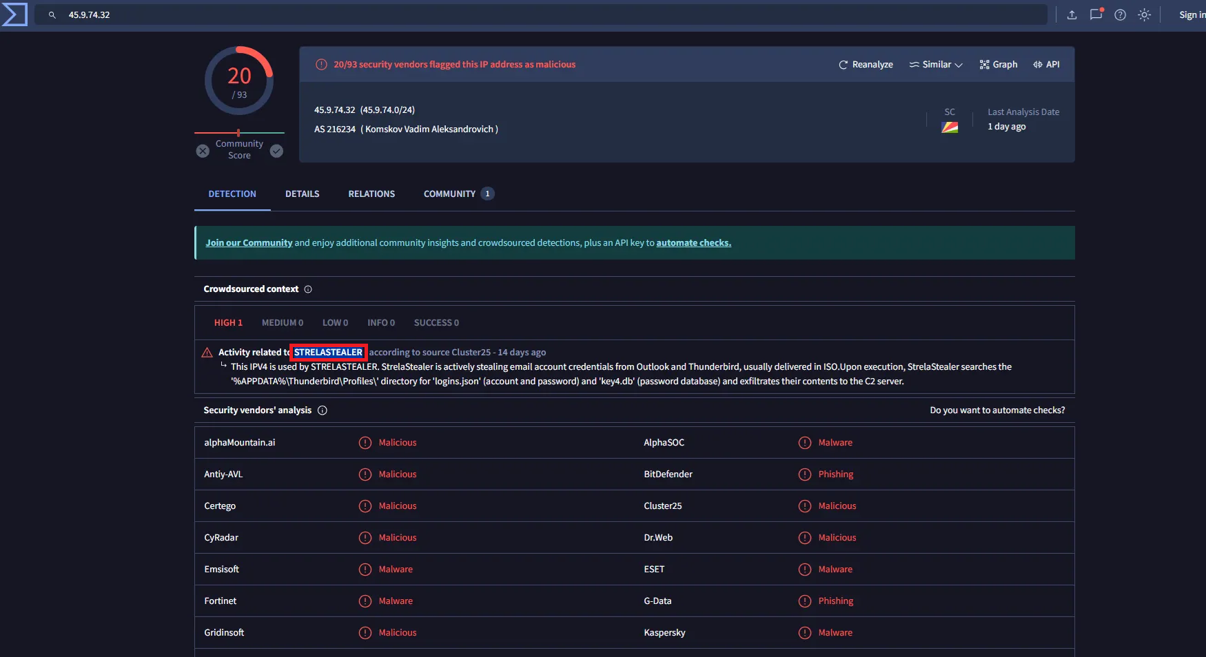 Under the Crowdsourced context section on VirusTotal, the IP address is associated with the malware family: StrelaStealer