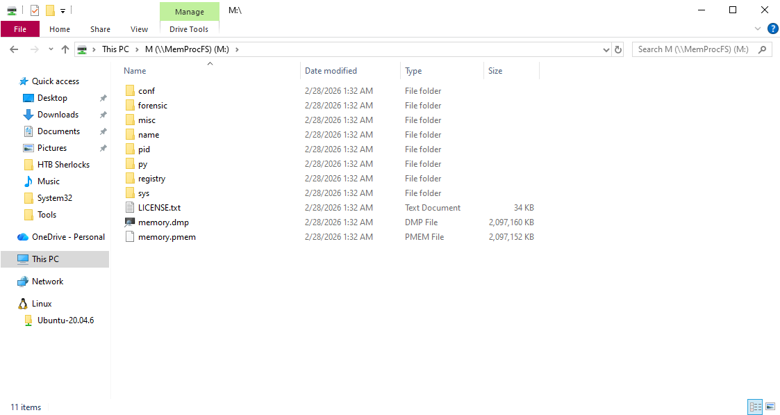 The investigation was conducted using MemProcFS, a memory forensics tool that exposes memory images as a mounted file system, allowing structured navigation of processes, network artifacts, and system objects.