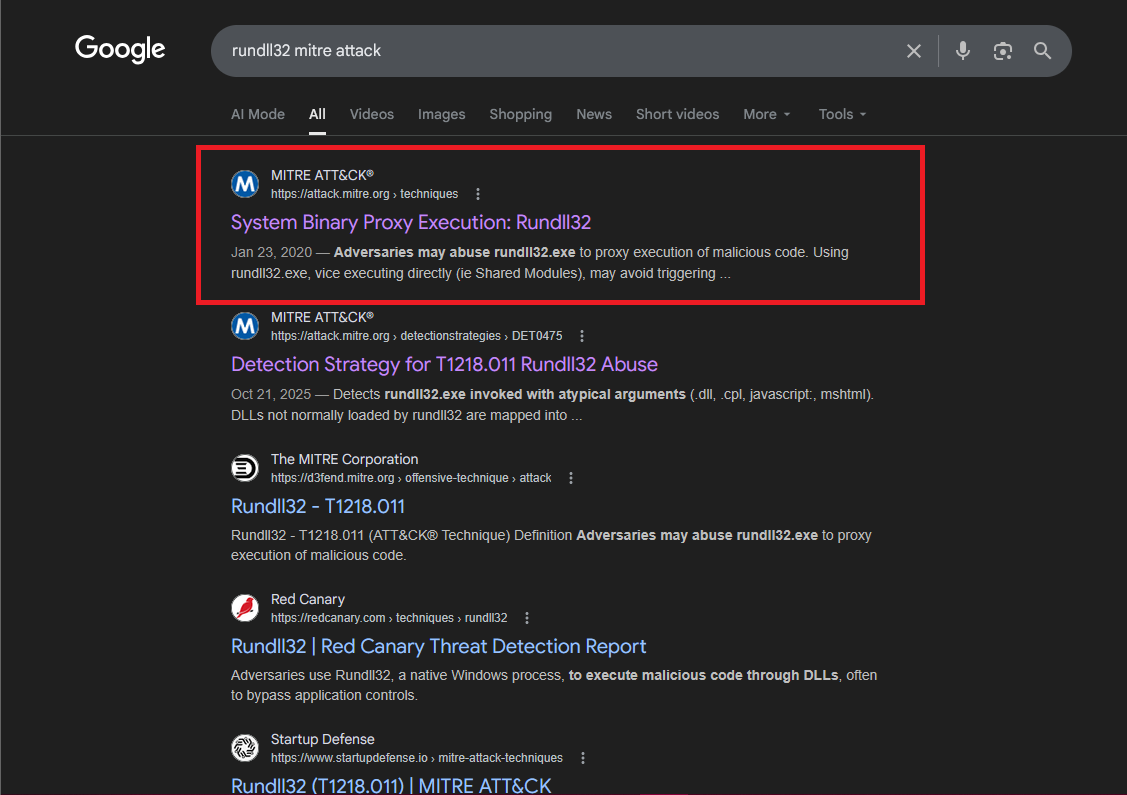 To identify the relevant MITRE ATT&CK sub-technique, I searched for rundll32 MITRE ATT&CK.