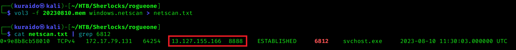 To determine the Command and Control (C2) infrastructure used by the attacker, I analyzed active and historical network connections from the memory image using the windows.netscan plugin, which generates a list of all established, listening, and pending connections. Since we previously identified the malicious process as PID 6812, I then filtered the results to isolate network connections associated specifically with that process.