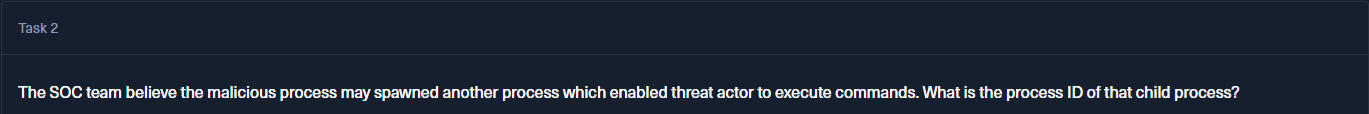 The SOC team believe the malicious process may spawned another process which enabled threat actor to execute commands. What is the process ID of that child process?