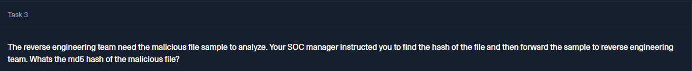 The reverse engineering team need the malicious file sample to analyze. Your SOC manager instructed you to find the hash of the file and then forward the sample to reverse engineering team. Whats the md5 hash of the malicious file?
