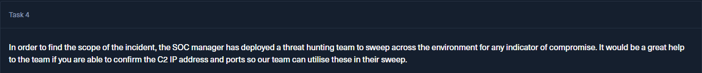 In order to find the scope of the incident, the SOC manager has deployed a threat hunting team to sweep across the environment for any indicator of compromise. It would be a great help to the team if you are able to confirm the C2 IP address and ports so our team can utilise these in their sweep.