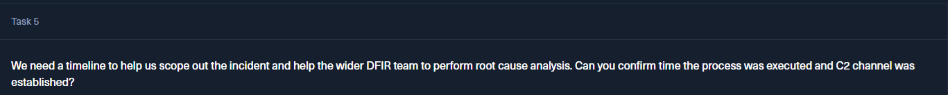 We need a timeline to help us scope out the incident and help the wider DFIR team to perform root cause analysis. Can you confirm time the process was executed and C2 channel was established?