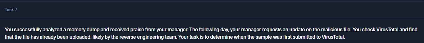 You successfully analyzed a memory dump and received praise from your manager. The following day, your manager requests an update on the malicious file. You check VirusTotal and find that the file has already been uploaded, likely by the reverse engineering team. Your task is to determine when the sample was first submitted to VirusTotal.