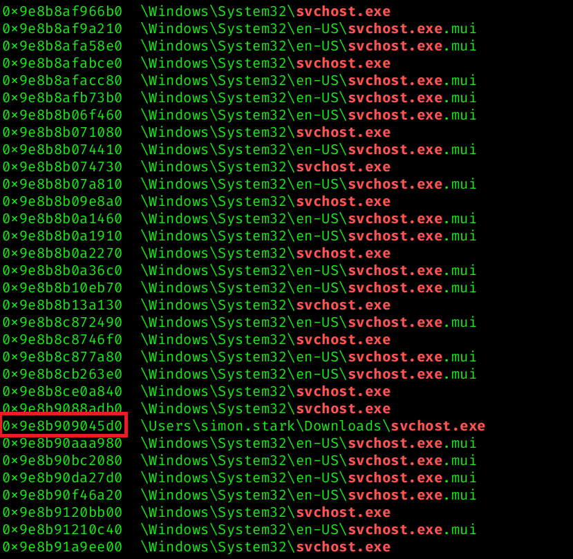 From the output, we identified the suspicious svchost.exe located in the Downloads directory with the following virtual address: 0x9e8b909045d0