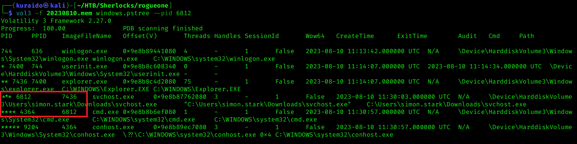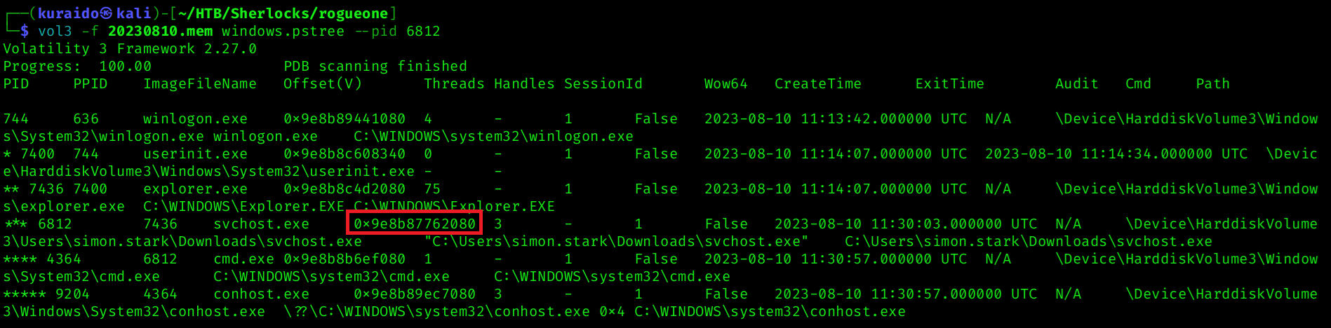 To determine the memory offset of the malicious process, I used the windows.pstree plugin and filtered for the previously identified malicious PID (6812):