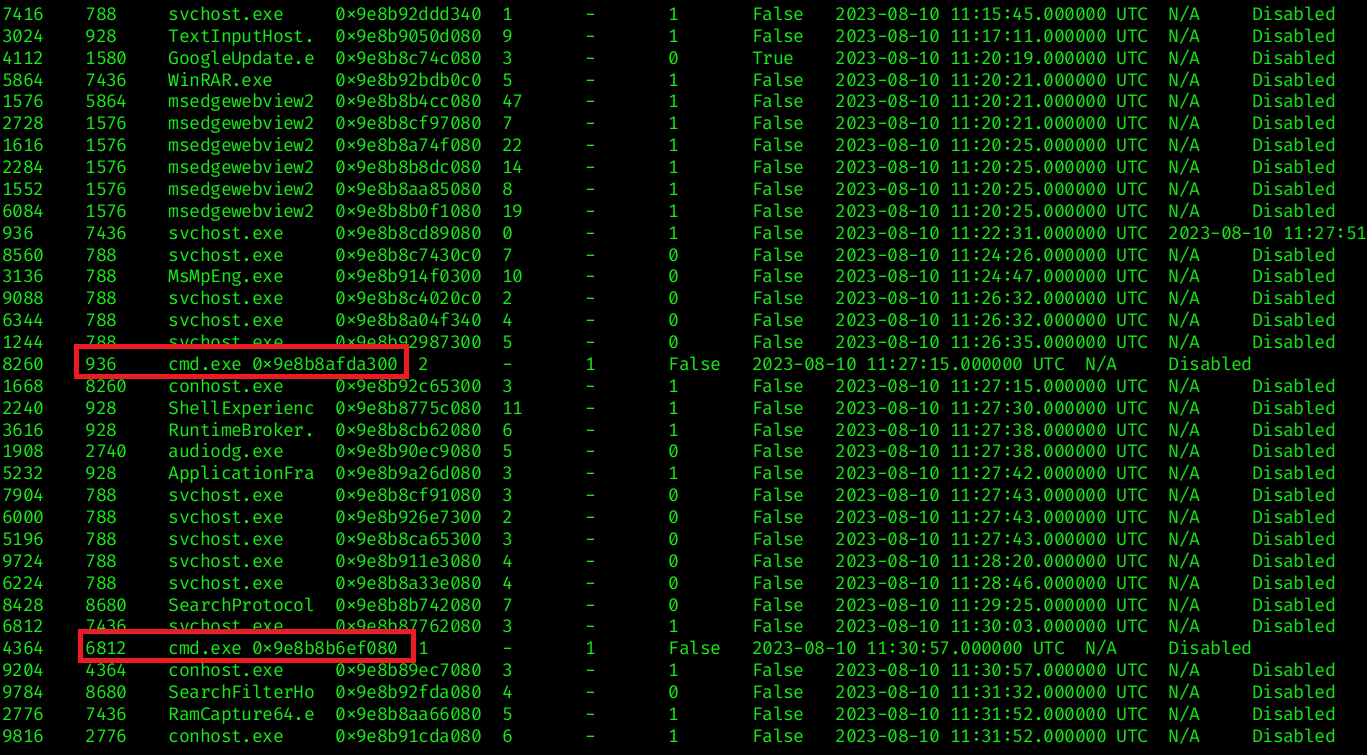 From the process list, two instances of svchost.exe stood out (PID 936 and PID 6812) because they spawned cmd.exe as a child process. While svchost.exe is a legitimate Windows process, it typically does not spawn command shells under normal circumstances.