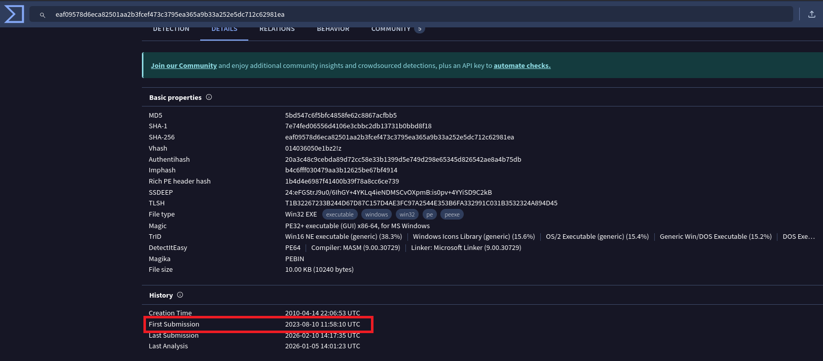 After searching the MD5 hash on VirusTotal, I navigated to the Details tab and reviewed the History section, where VirusTotal provides metadata including submission timestamps.