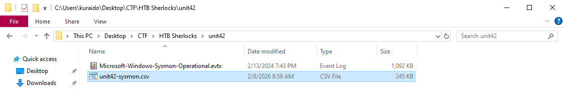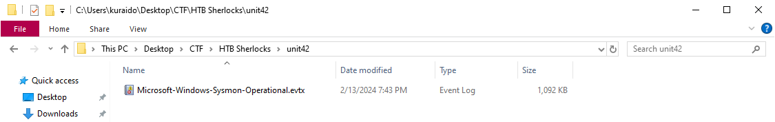 We are given a file named unit42.zip, which contains the following Sysmon log: