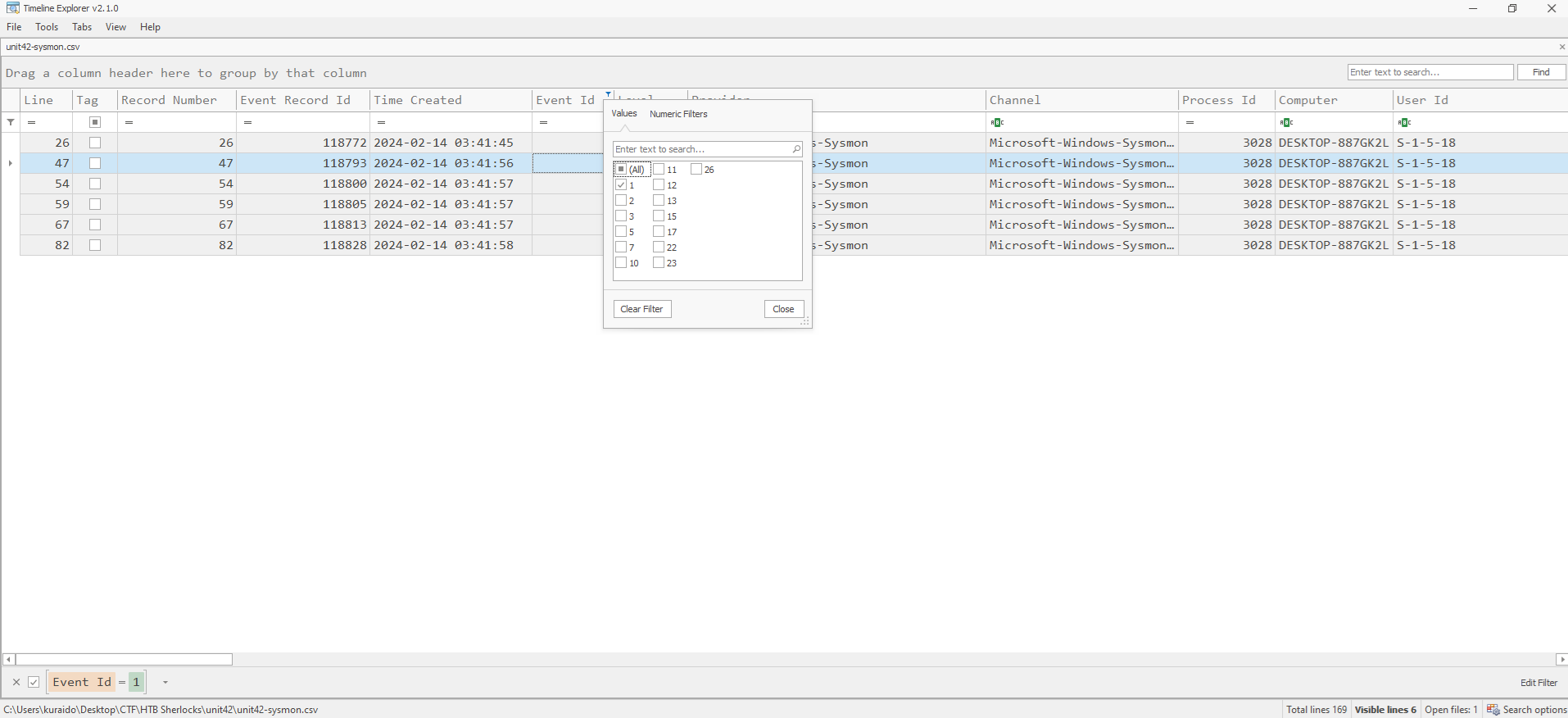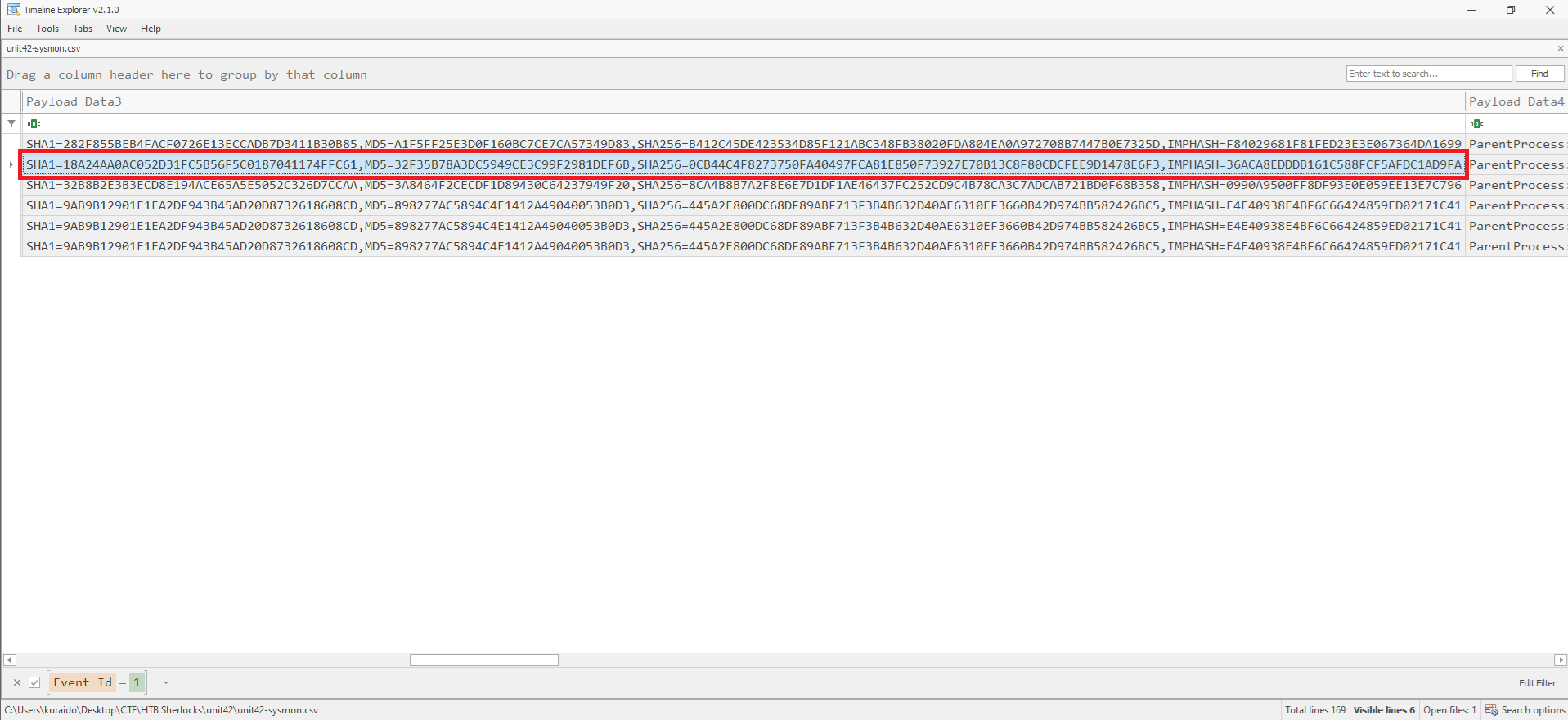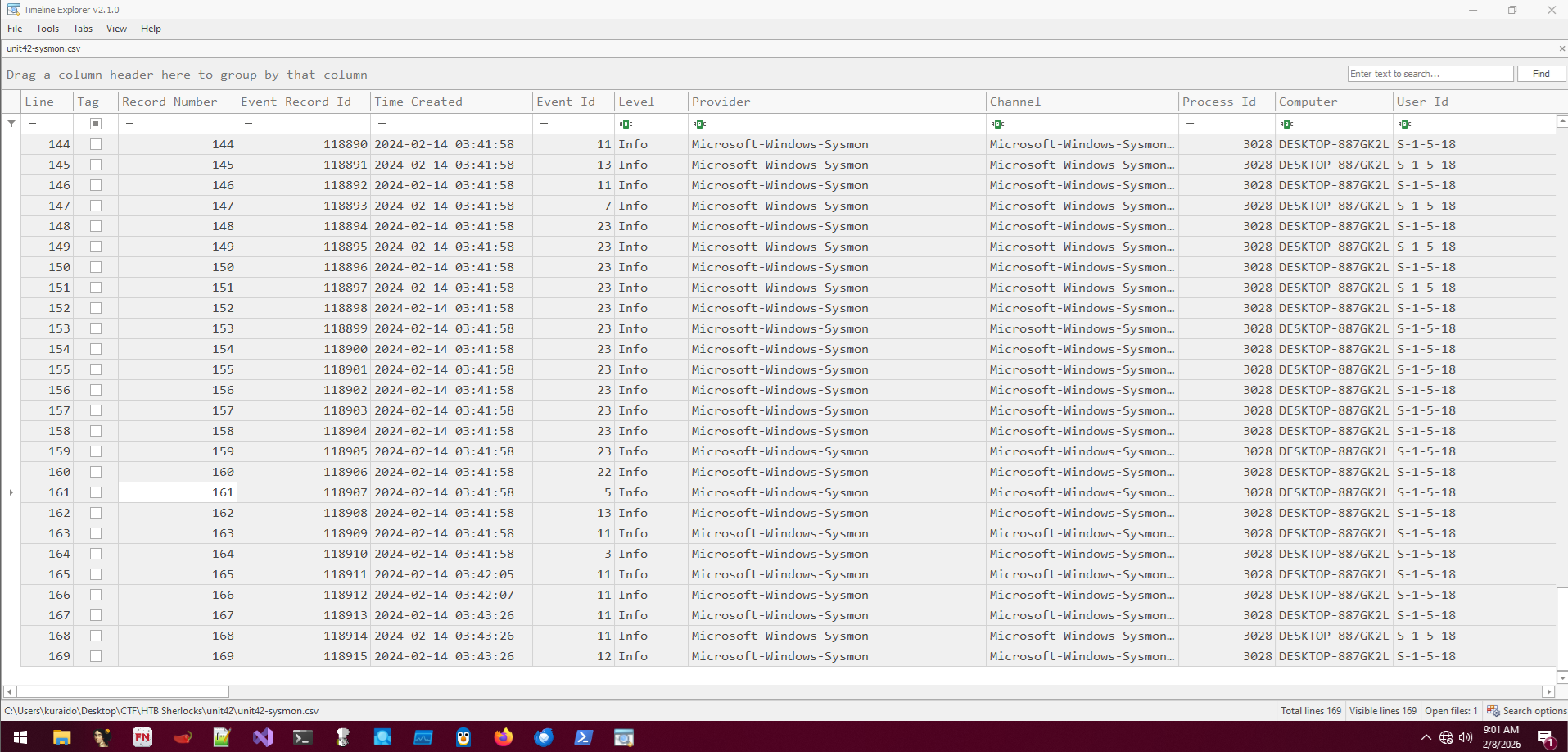 The Sysmon log was parsed into CSV format and analyzed using Timeline Explorer.
