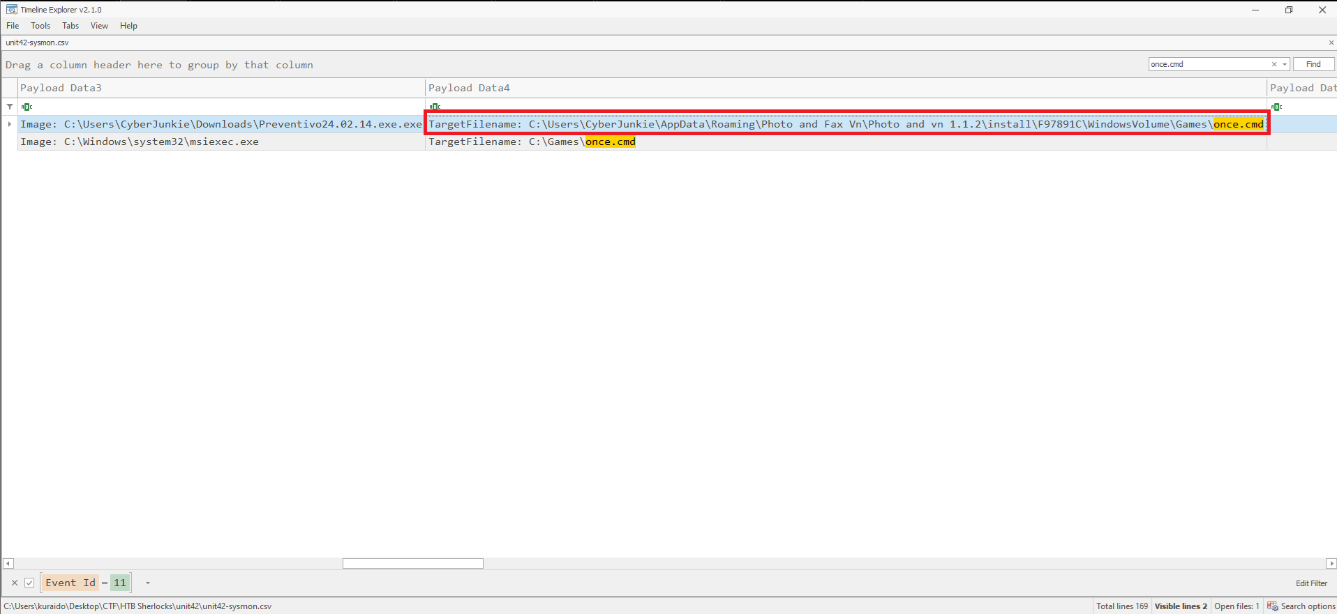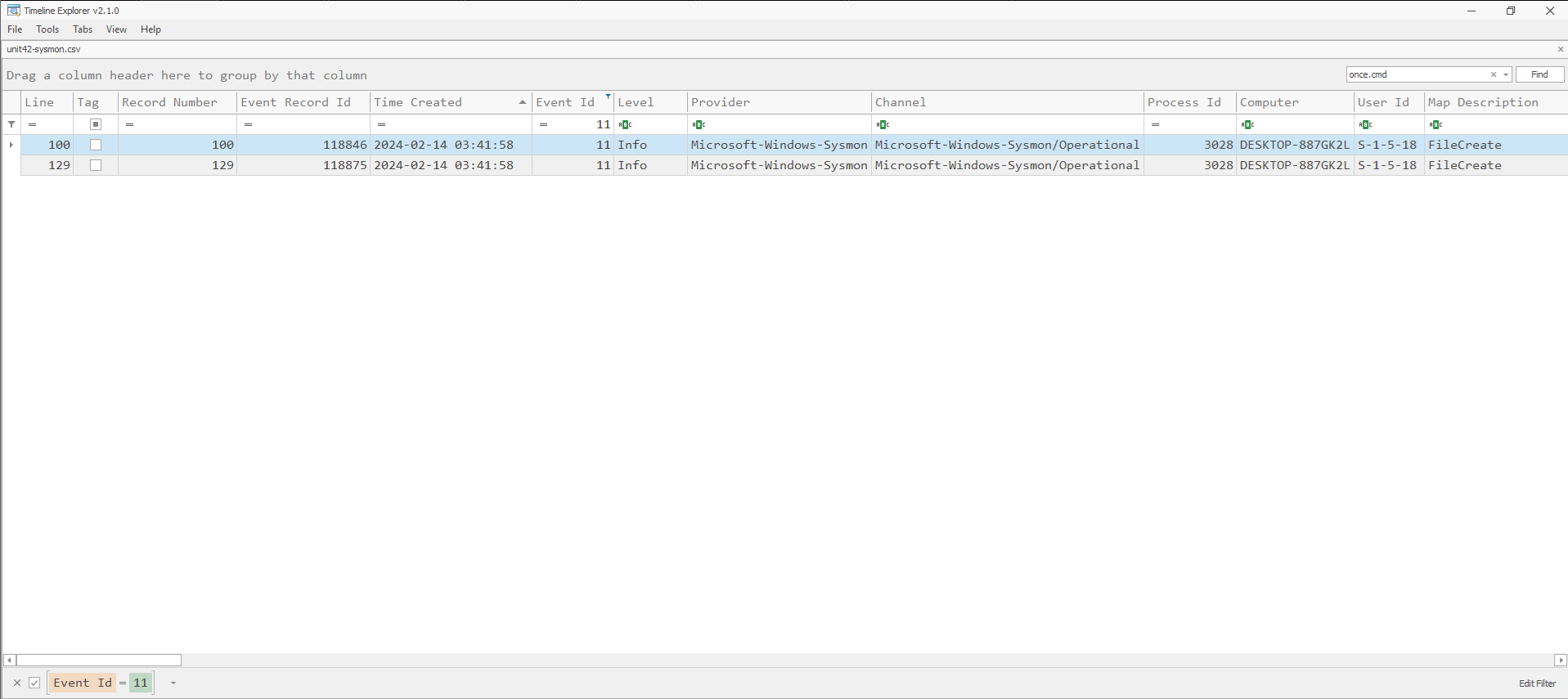 To locate where once.cmd was created, we filter Event ID 11 in Timeline Explorer and search for once.cmd.