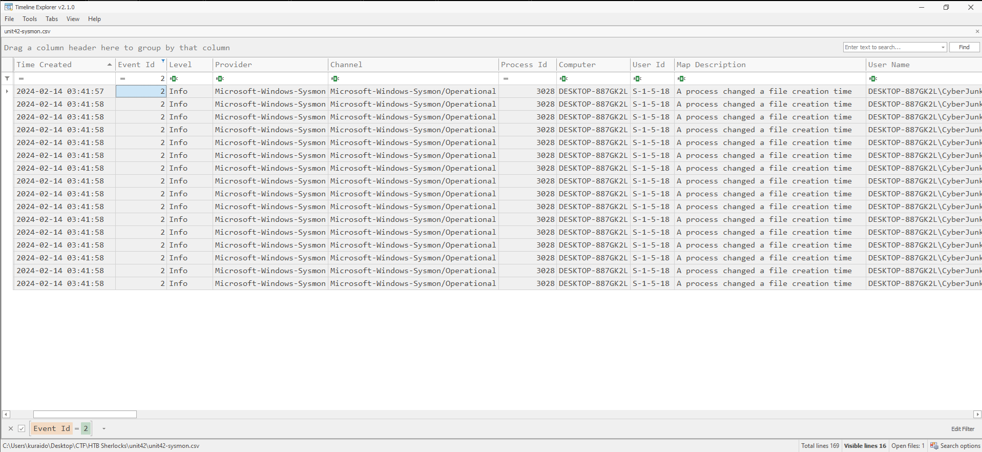 To identify Time Stomping activity, we filter Event ID 2 in Timeline Explorer.