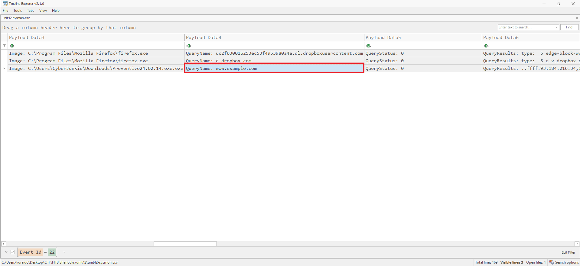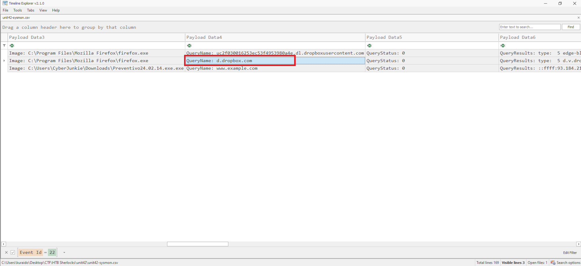 To identify the cloud drive used to distribute the malware, we filter Event ID 22 in Timeline Explorer.