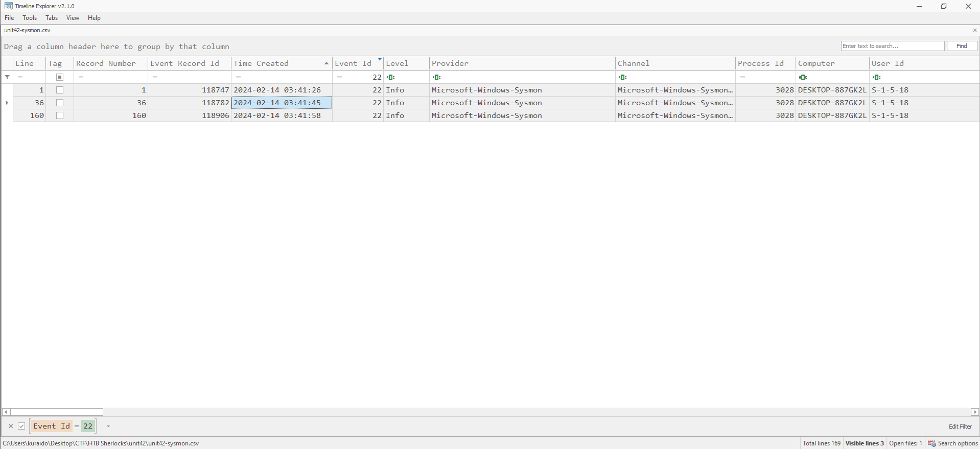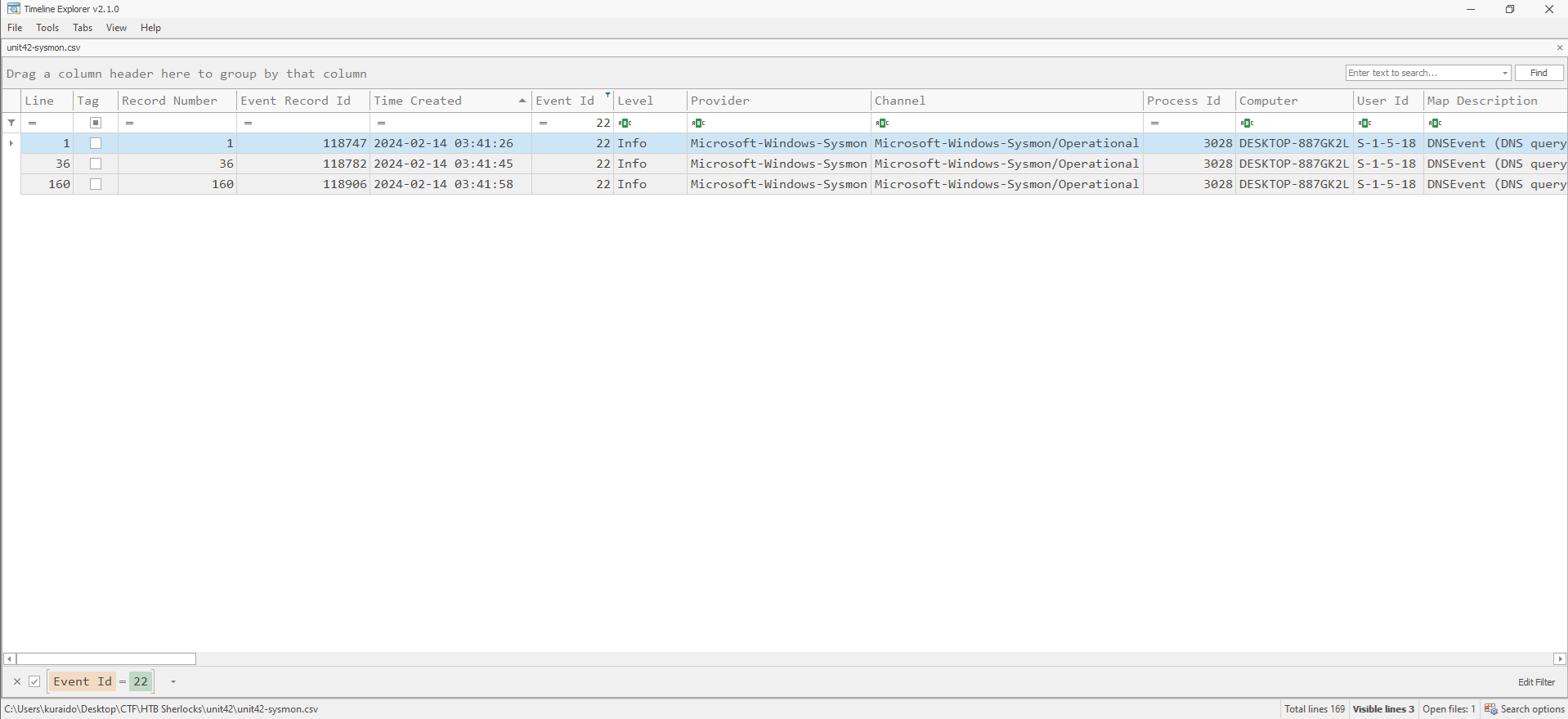 To answer this question, we filter Event ID 22 in Timeline Explorer.