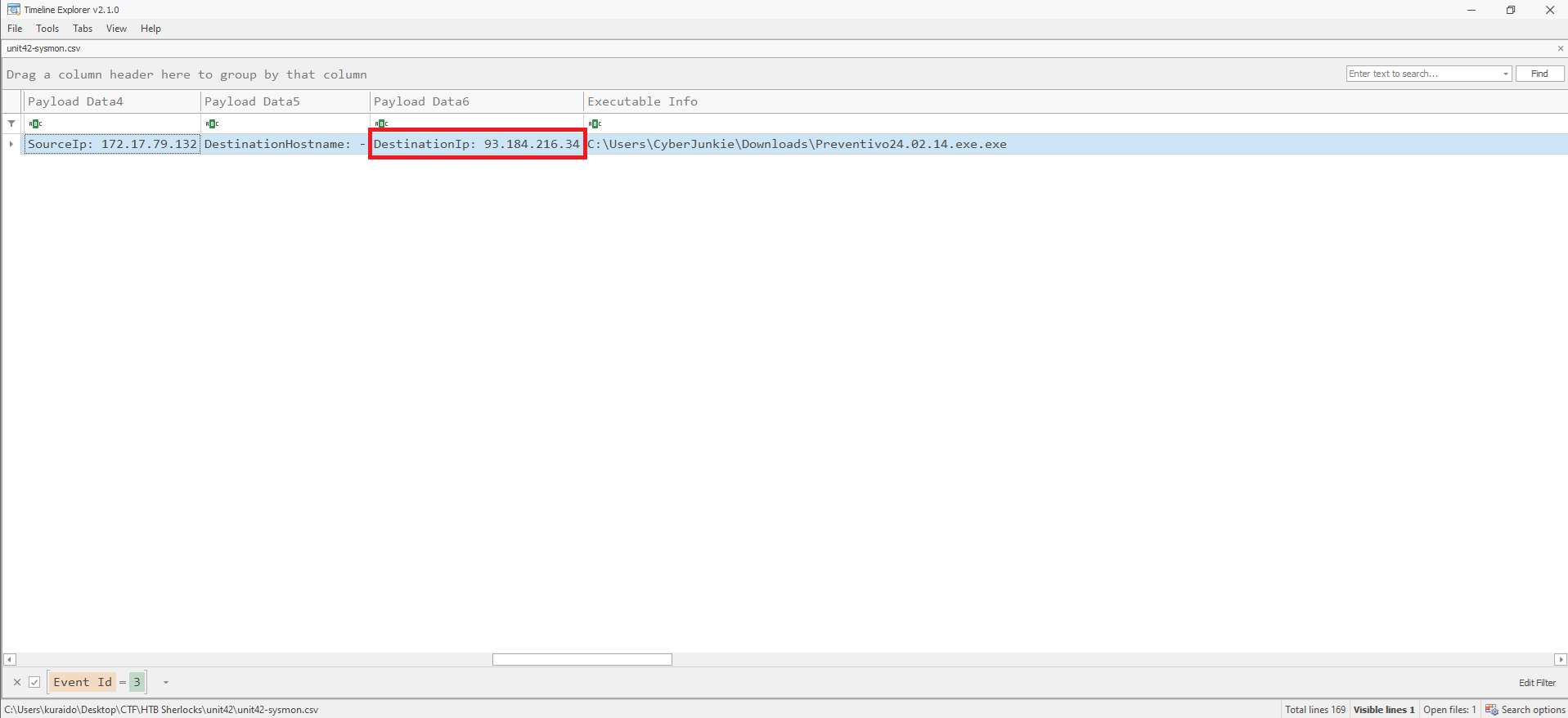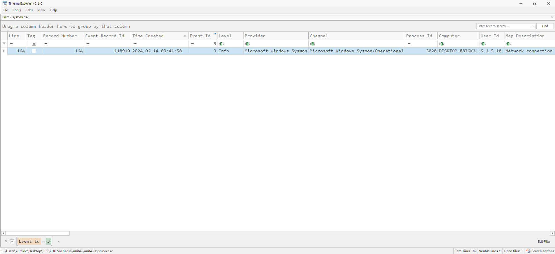 To identify the IP address contacted by the malicious process, we filter Event ID 3 in Timeline Explorer.
