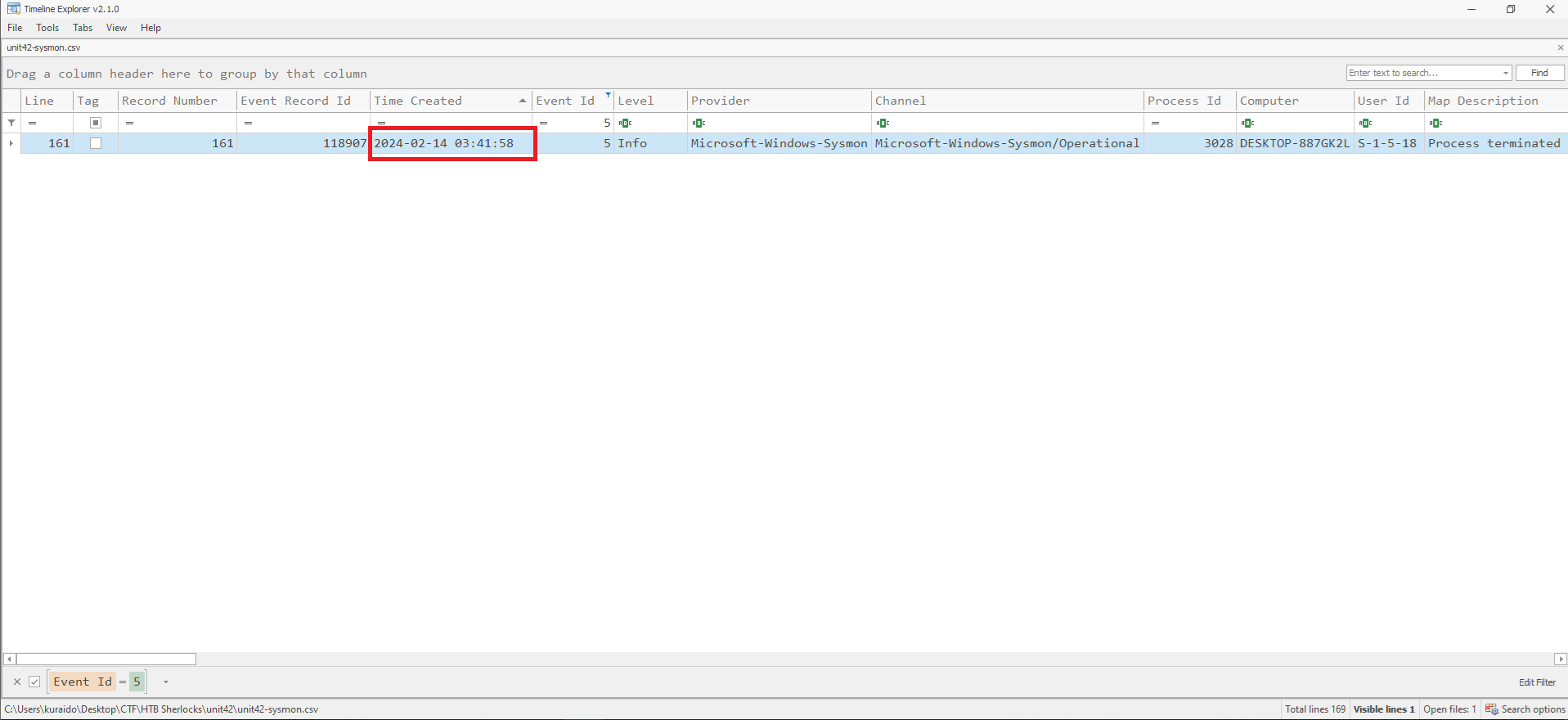 By filtering Event ID 5 (Process terminated) in Timeline Explorer, the termination time of the malicious process can be identified, as shown in the Time Created field.