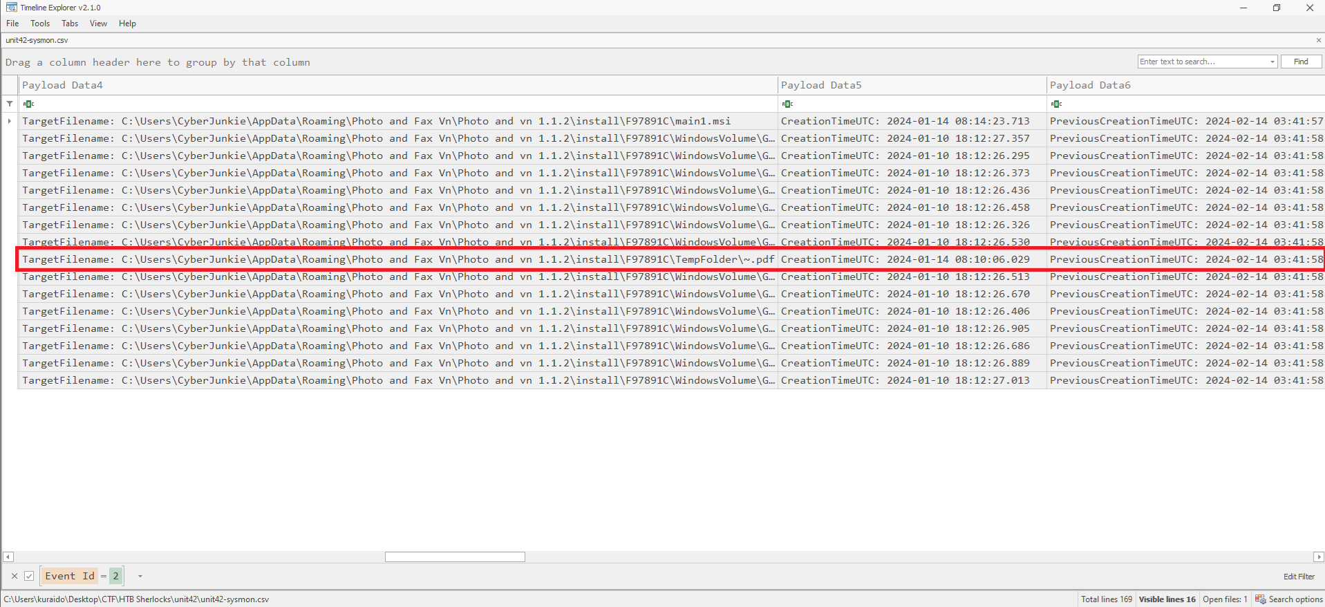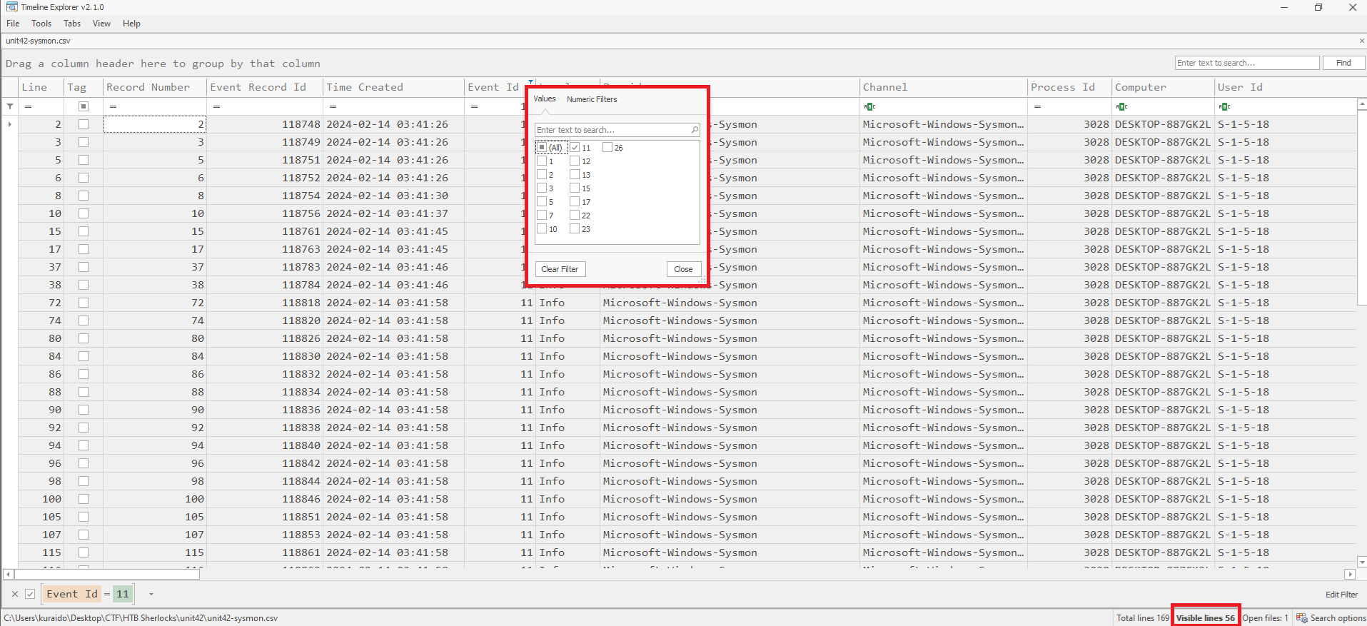 To answer this question, we filter Event ID 11 in Timeline Explorer.