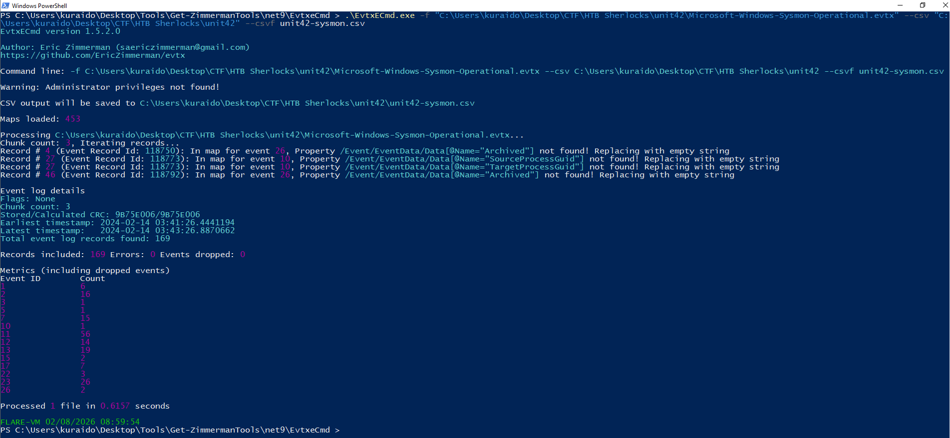 - EvtxECmd (to parse the EVTX file into CSV format)