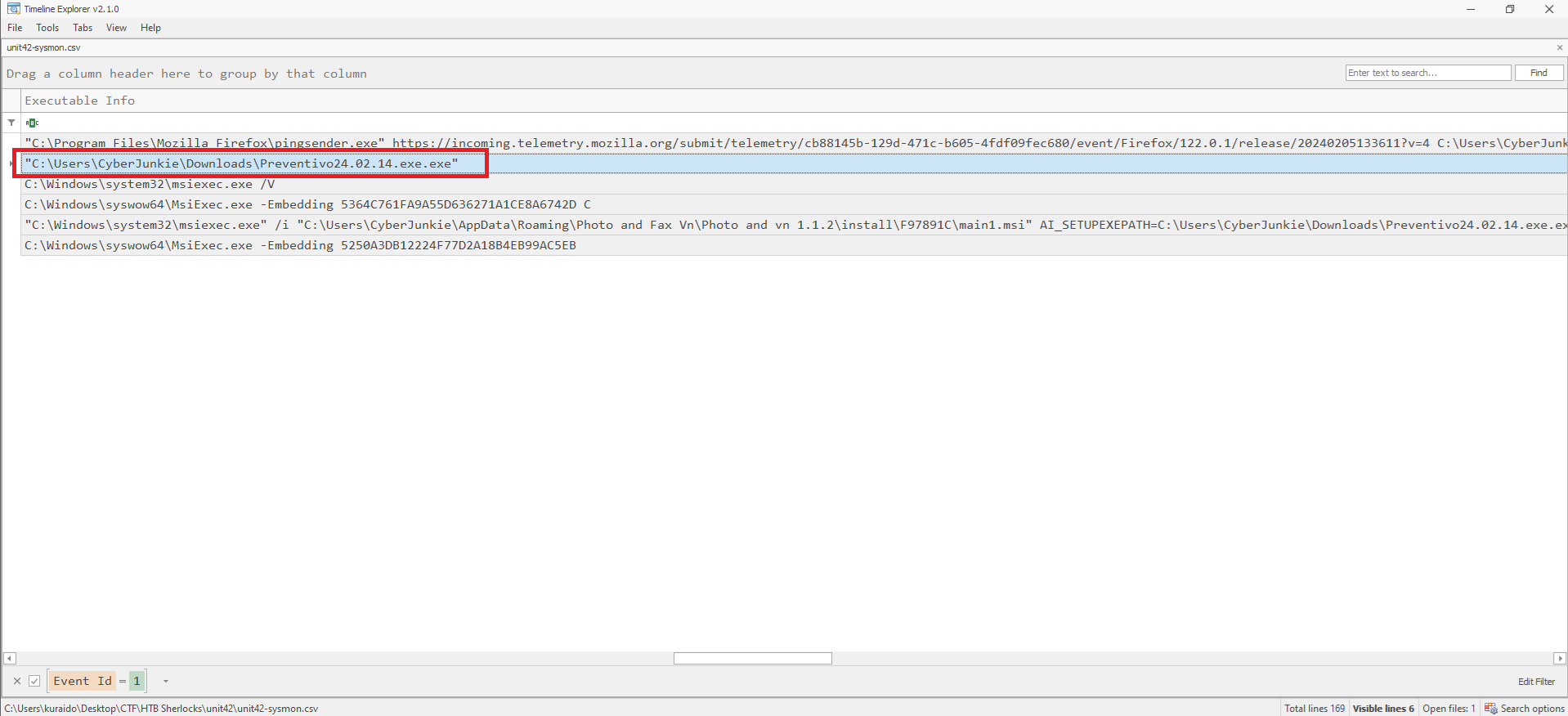 To identify the malicious process, we filter Event ID 1 in Timeline Explorer.