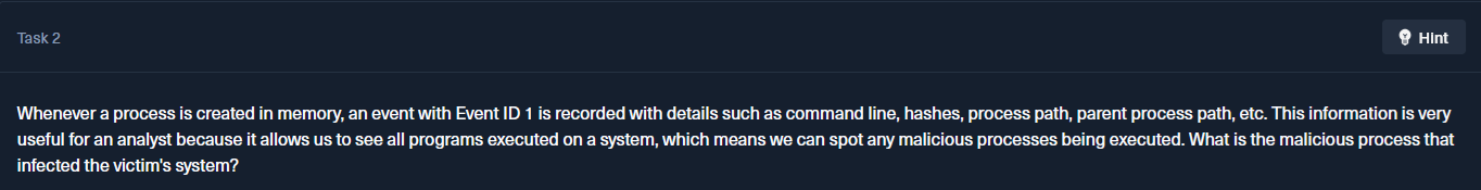 Whenever a process is created in memory, an event with Event ID 1 is recorded with details such as command line, hashes, process path, parent process path, etc. This information is very useful for an analyst because it allows us to see all programs executed on a system, which means we can spot any malicious processes being executed. What is the malicious process that infected the victim’s system?