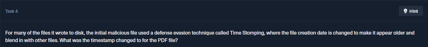 For many of the files it wrote to disk, the initial malicious file used a defense evasion technique called Time Stomping, where the file creation date is changed to make it appear older and blend in with other files. What was the timestamp changed to for the PDF file?
