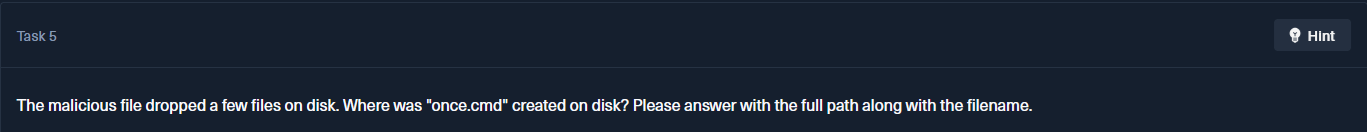 The malicious file dropped a few files on disk. Where was “once.cmd” created on disk? Please answer with the full path along with the filename.
