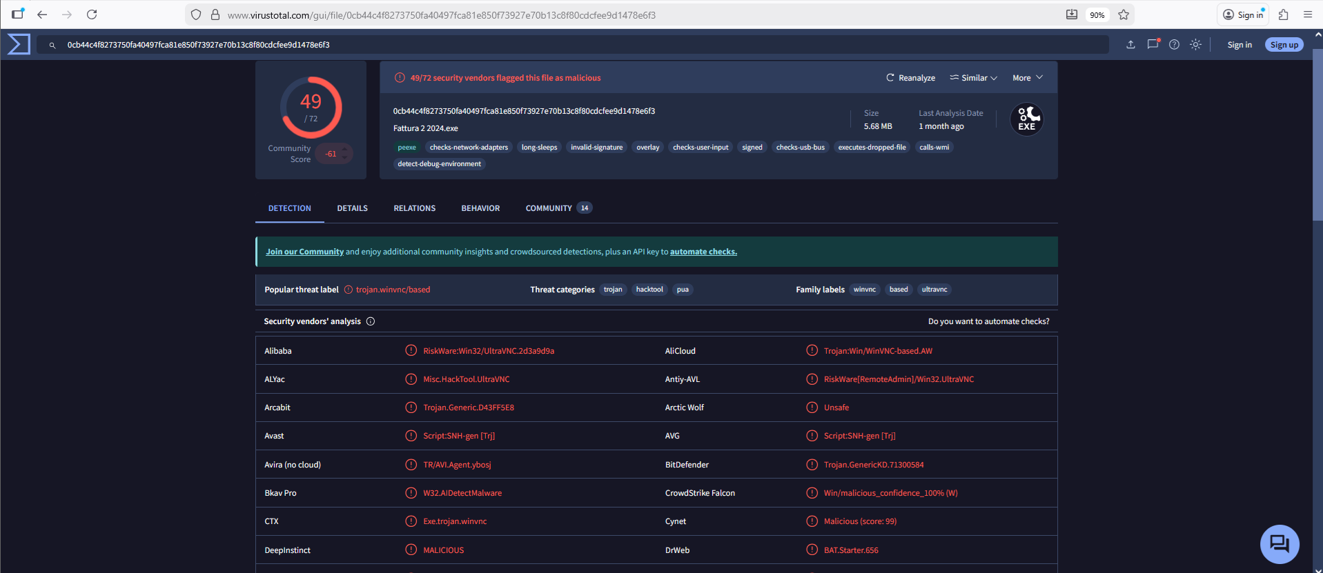 Based on the VirusTotal results, 49 security vendors flagged the file as malicious, confirming it as the malware responsible for infecting the system.